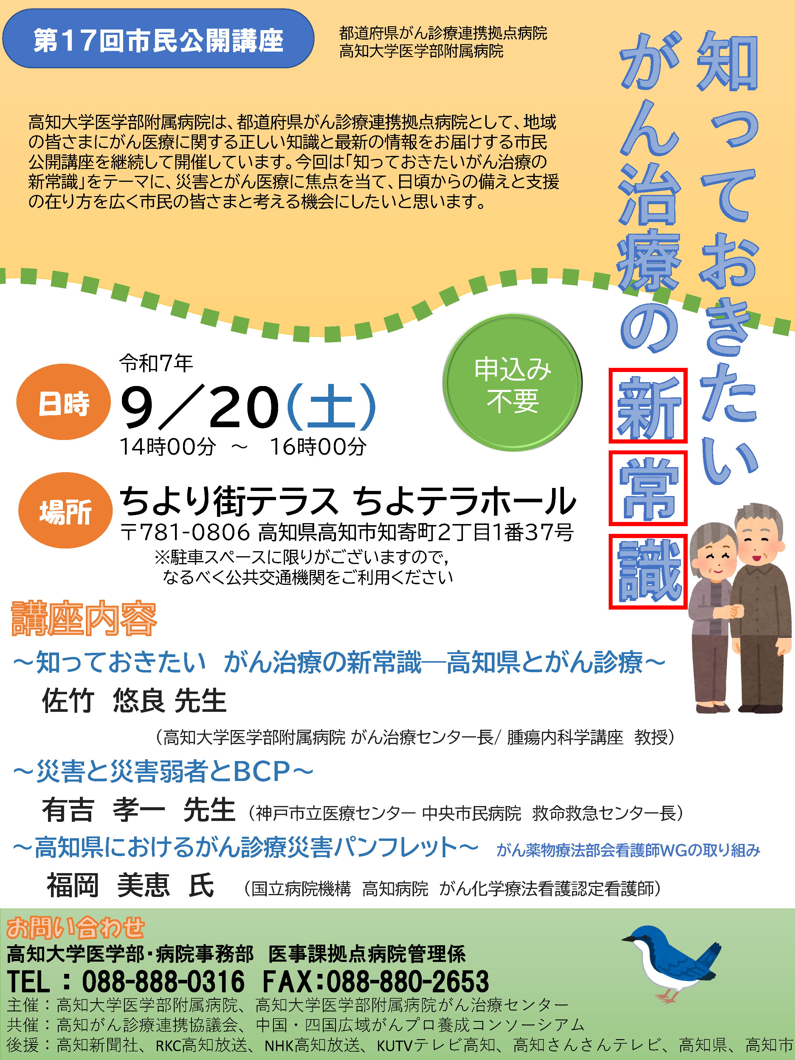高知大学医学部附属病院は、都道府県がん診療連携拠点病院として、地域の皆さまにがん医療に関する正しい知識と最新の情報をお届けする市民公開講座を継続して開催しています。今回は「知っておきたいがん治療の新常識」をテーマに、災害とがん医療に焦点を当て、日頃からの備えと支援の在り方を広く市民の皆さまと考える機会にしたいと思います。
