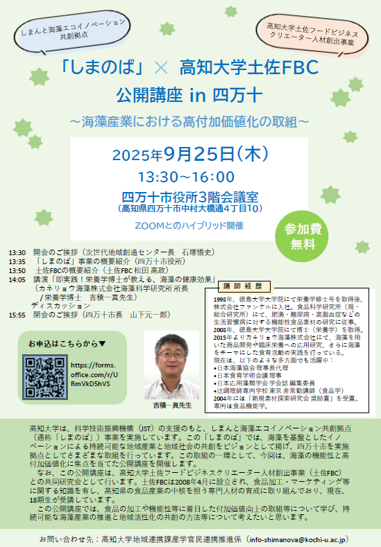 「しまんと海藻エコイノベーション共創拠点」(通称(しまのば))と高知大学土佐フードビジネスクリエーター人材創出事業(土佐FBC)との共同研究会として、公開講座を開催します。