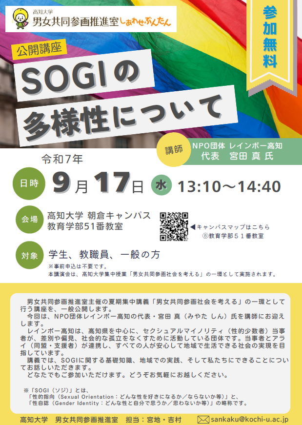このたび男女共同参画推進室では、公開講座「SOGIの多様性について」を開催いたします。