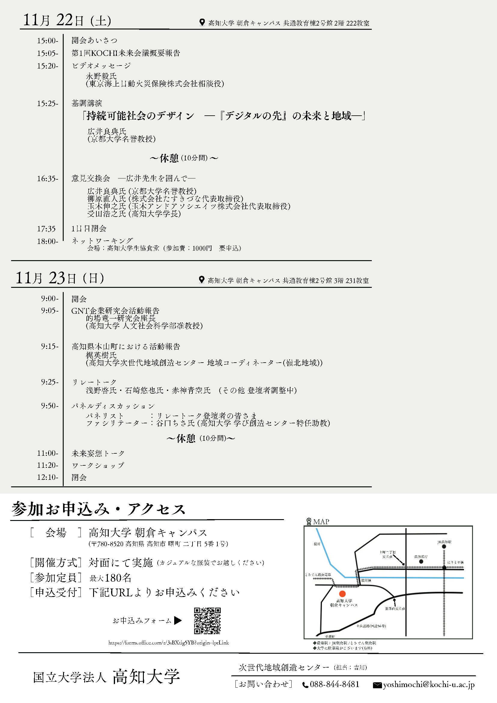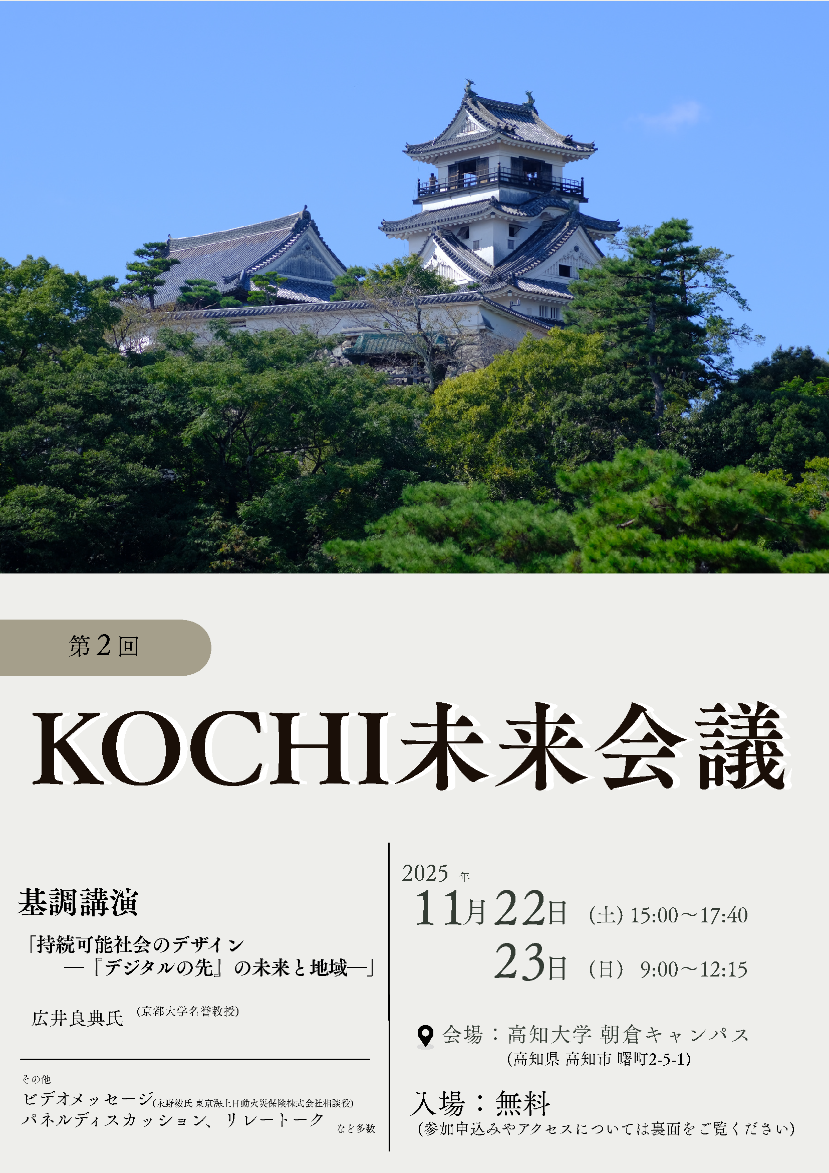 第2回目となる今回は環境・福祉・経済を統合した「定常型社会=持続可能な福祉社会」を提唱する広井良典氏(京都大学名誉教授)を講師に迎え、県内外からの参加者と共に高知の未来を議論します。