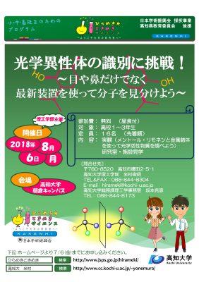 ひらめき☆ときめきサイエンス~ようこそ大学の研究室へ~KAKENHI「光学異性体の識別に挑戦!~目や鼻だけでなく最新装置を使って分子を見分けよう~」