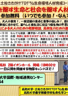 農学部・土佐さきがけプログラム生命環境人材育成コース公開講座「暮らしを醸す生命と社会を醸す人材発掘!」(10月4日、11日、11月3日)