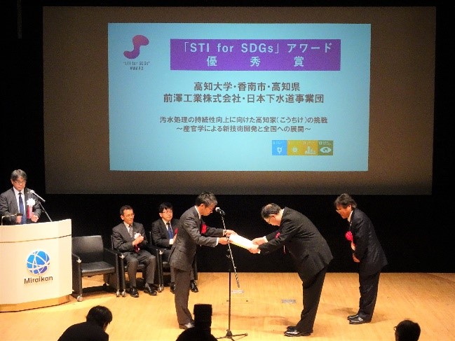 本学自然科学系農学部門の藤原拓教授を含む産学官連携チーム(高知大学、香南市、高知県、前澤工業株式会社、日本下水道事業団の5団体)に『優秀賞』が授与され、本学の櫻井克年学長と香南市 宮田憲一上下水道課長が代表して賞状を受け取りました。
