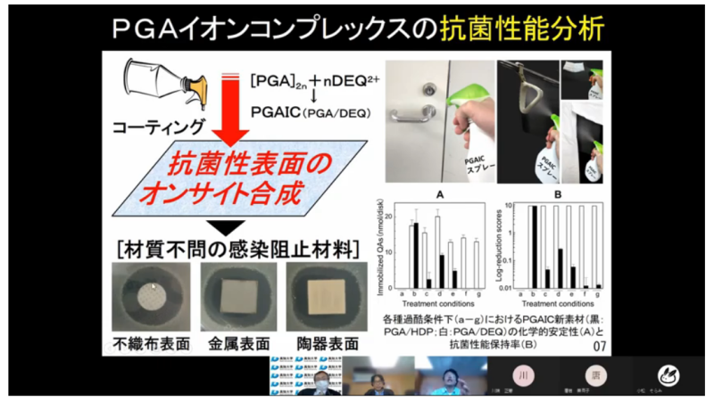 次に、総合科学系生命環境医学部門の芦内誠教授が「SDGsのその先へ、ごみという概念のない社会をつくるために。〜バイオプラ新素材にできること〜」の演題で、納豆の糸や古細菌の分泌液に含まれるポリグルタミン酸をイオン結合させて作る生分解性バイオプラスチックの有用性について紹介しました。