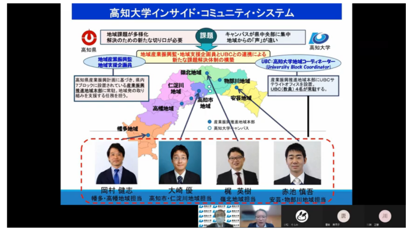 最後に、総合科学系地域協働教育学部門の梶英樹講師が、「高知大学と自治体との連携によるローカルSDGsの取組」の演題で、4名の地域コーディネーター(UBC)による地域課題の掘り起こしと、課題解決に大学研究者を巻き込むコーディネート活動の重要性について紹介しました。