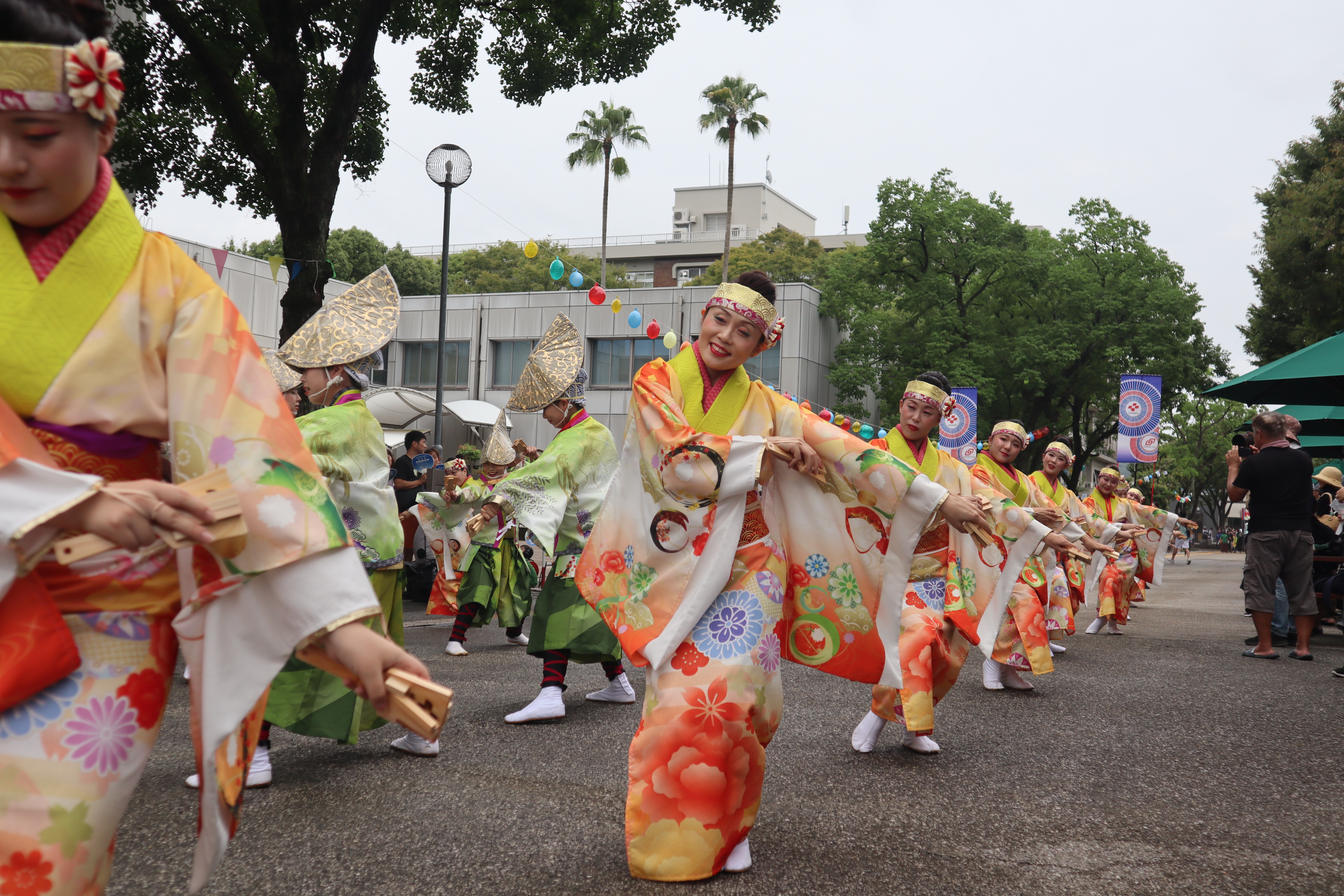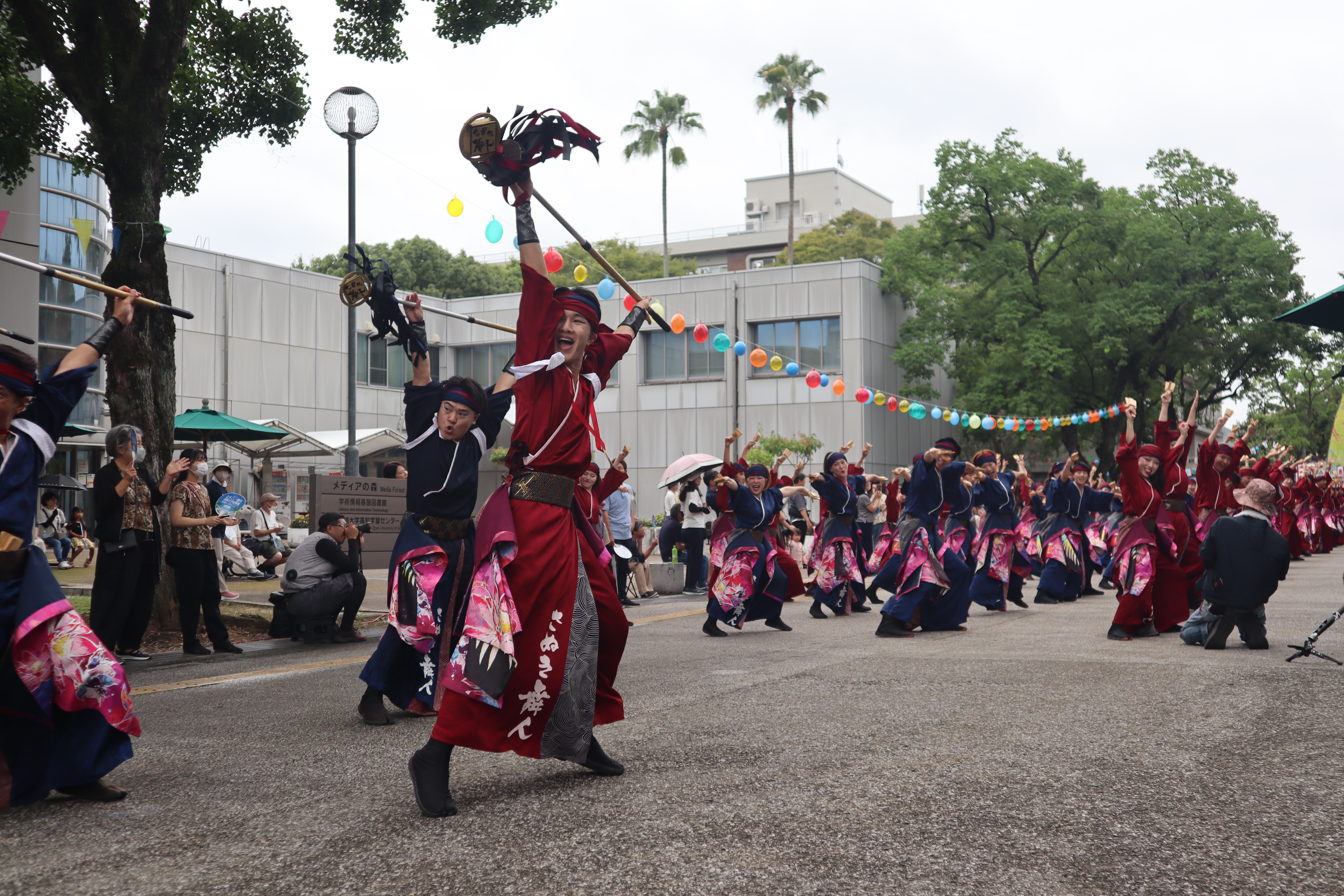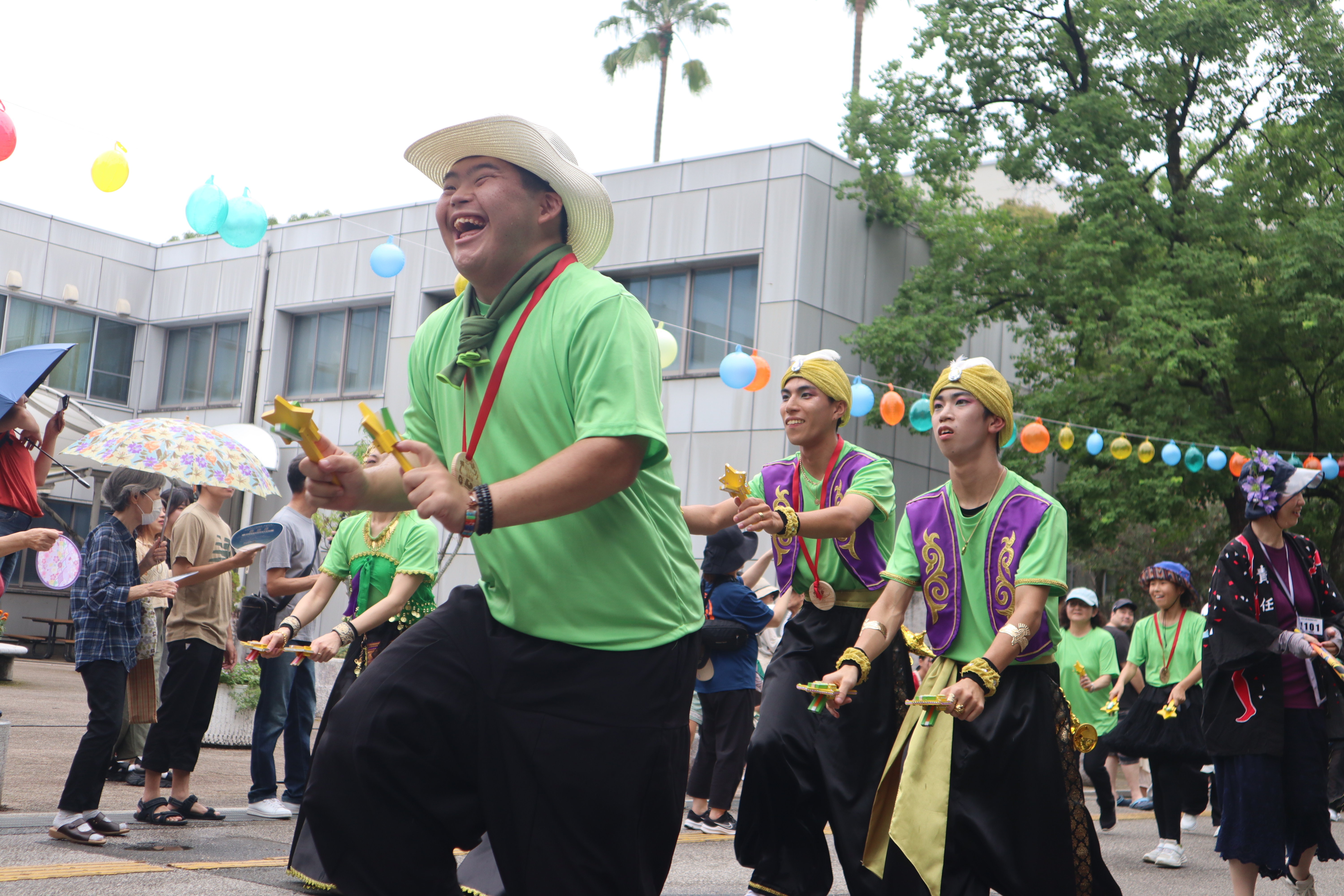 二日間で、本学の学生チームや卒業生が多く在籍するチーム、高知県外から参加したチームなど、全26チーム・総勢1,900名を超える踊り子たちが、ヤシの木が並ぶキャンパスメインストリートで華やかな演舞を披露しました。