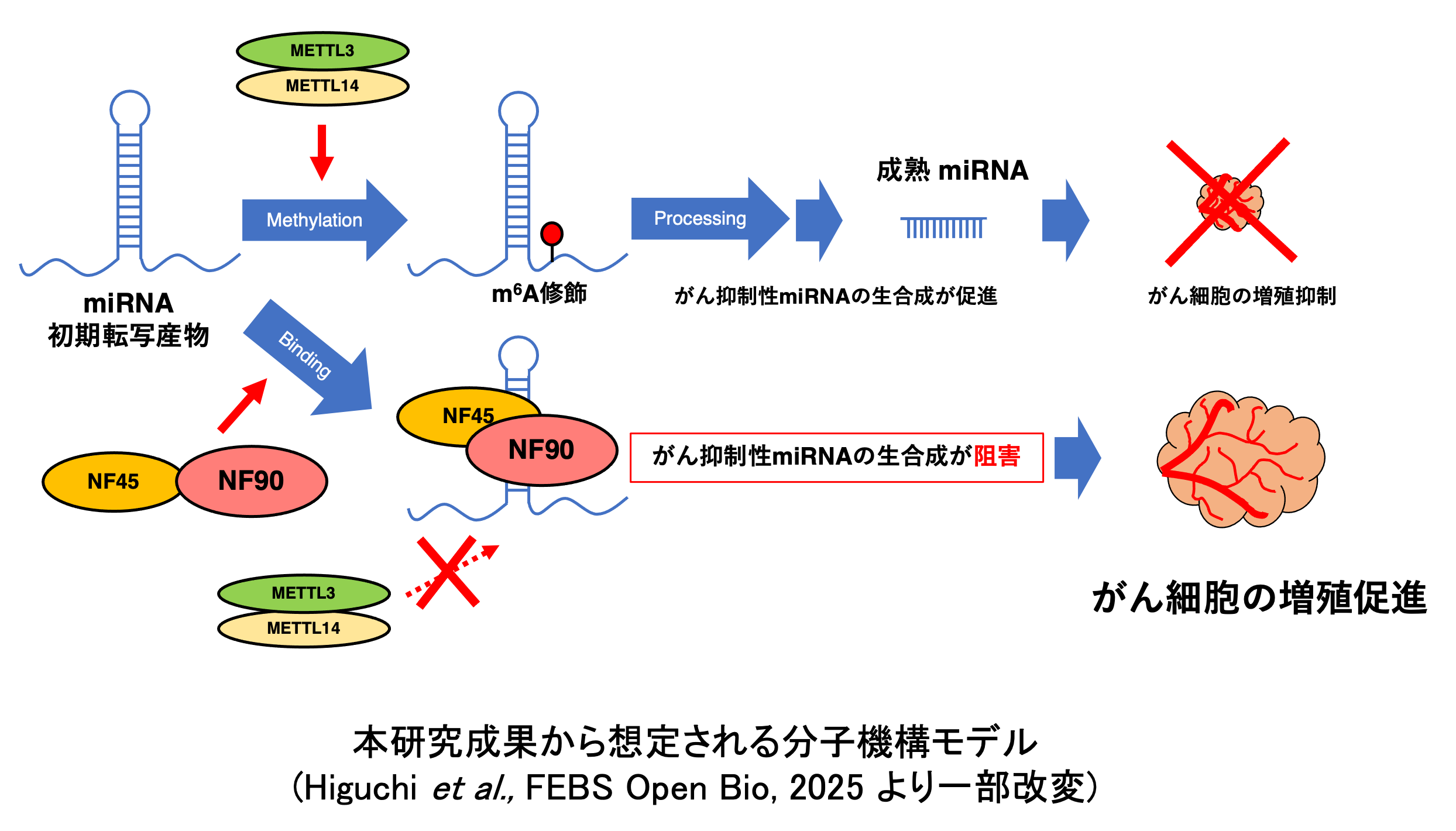 本研究グループではこれまで、二本鎖RNA結合タンパク質であるNuclear Factor 90(NF90)とその結合パートナー NF45の複合体(NF90–NF45)がpri-miRNAに結合し、miRNA生合成を負に制御することを見出してきました。本研究では、NF90–NF45と高い結合能を有するpri-miRNAにおいて、NF90-NF45が当該pri-miRNAのm6A修飾を阻害することを明らかにしました。