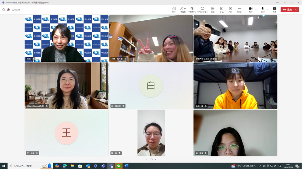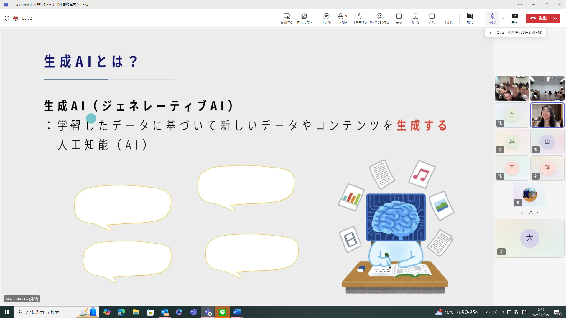 2024年12月18日(水)に、高知大学グローバル教育支援センター主催の協定校間特別セミナーが行われました。講師には、韓国の協定校の釜山外国語大学校日本IT専攻の三國喜保子先生をお招きし、「外国語学習と生成AI」というテーマで学生と相互交流をしながら講義が行われました。今回のセミナーは韓国から三國先生に接続していただきMicrosoft teams上で行いましたが、高知大学の留学生ならびに日本人学生のほか、海外の協定校である中国の安徽大学からもクラス単位で参加していただき、合計70名ほどの参加となりました。