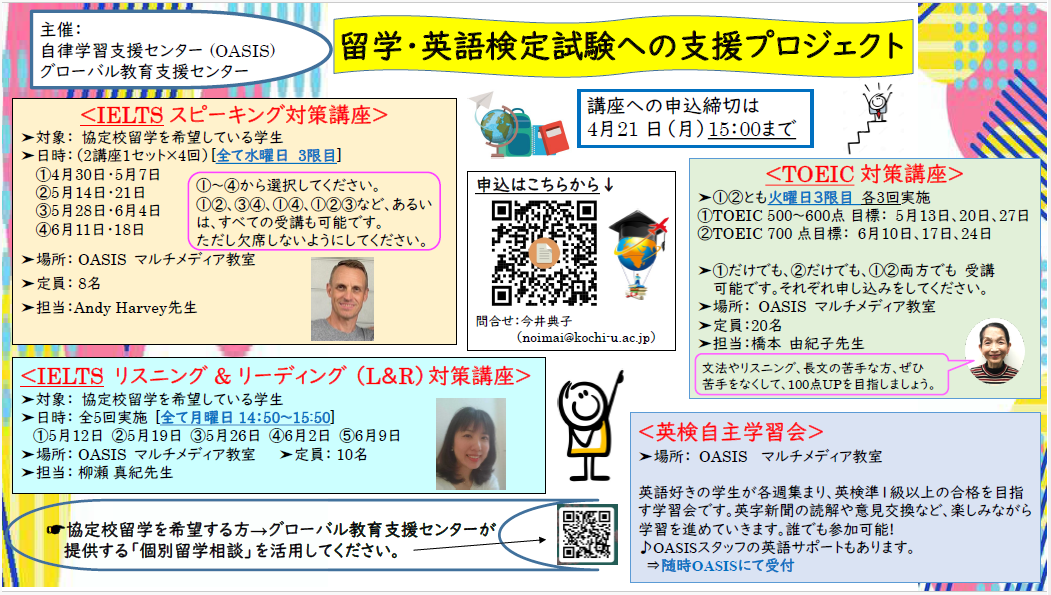 自律学習支援センターおよびグローバル教育支援センターでは、英語力向上を目指す学生の皆さんを対象に、以下の講座を提供します。