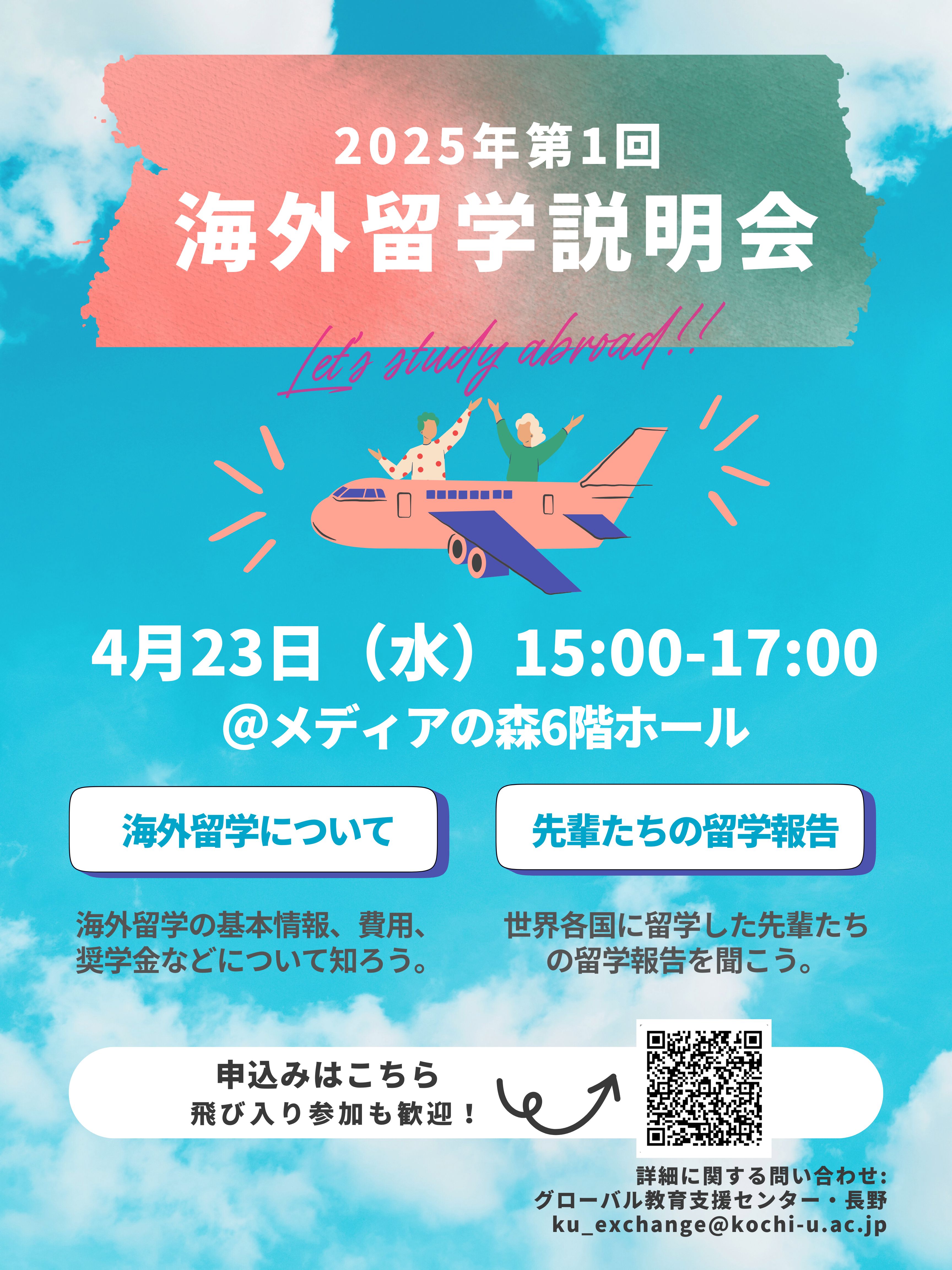 グローバル教育支援センターは、本学の学生を対象に、海外留学説明会を開催します。海外留学に関心のある方はぜひご参加ください。