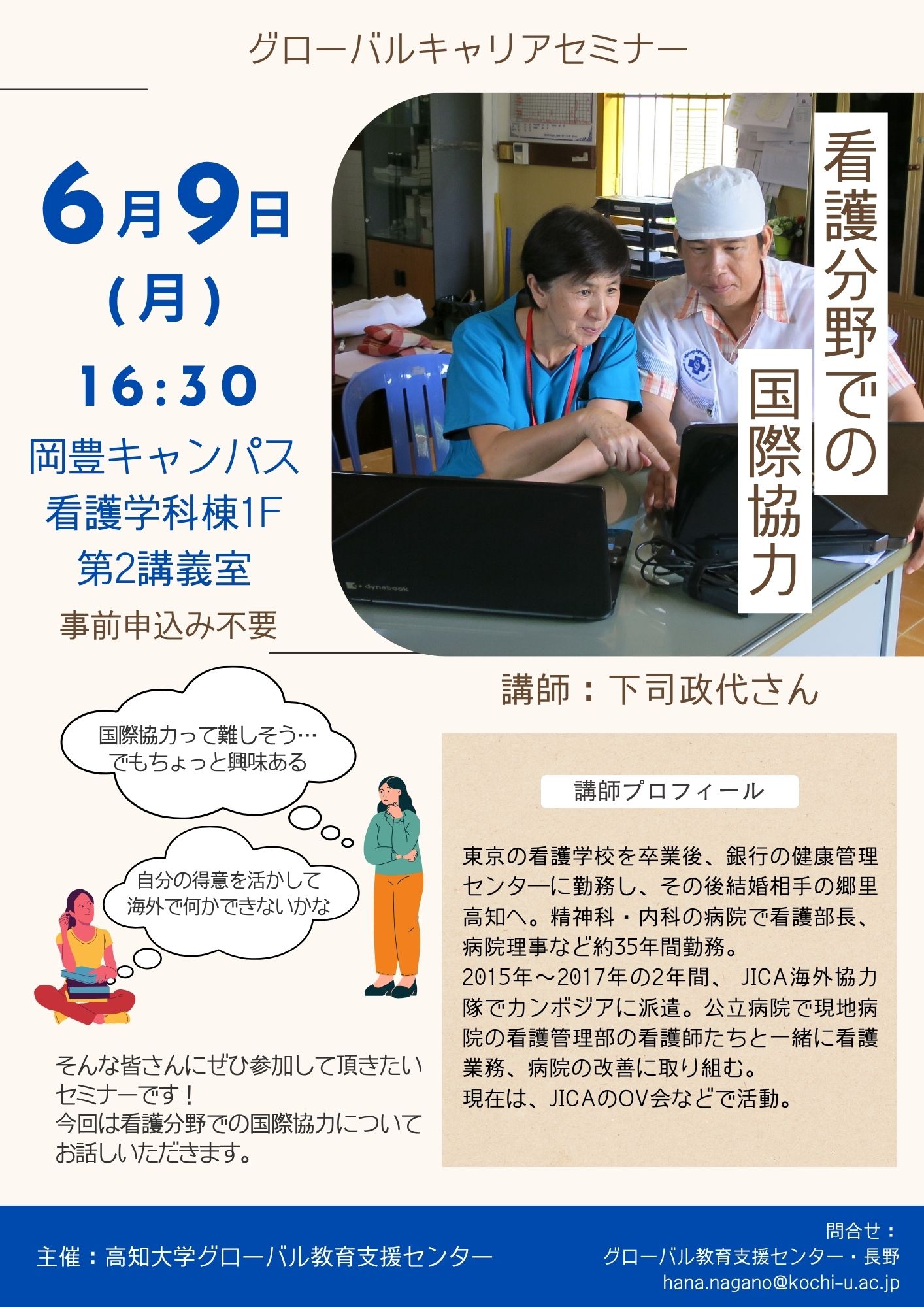高知で看護師として35年間勤務されたあと、2015〜2017年の2年間、国際協力機構(JICA)海外協力隊員として、カンボジアで看護業務や病院の改善に取り組まれた下司政代さんをお招きし、国際協力の現場や貴重な体験についてお話を伺います。国際協力に関心のある方はもちろん、将来のキャリアを考える上でもとても参考になるお話を聞くことができます。