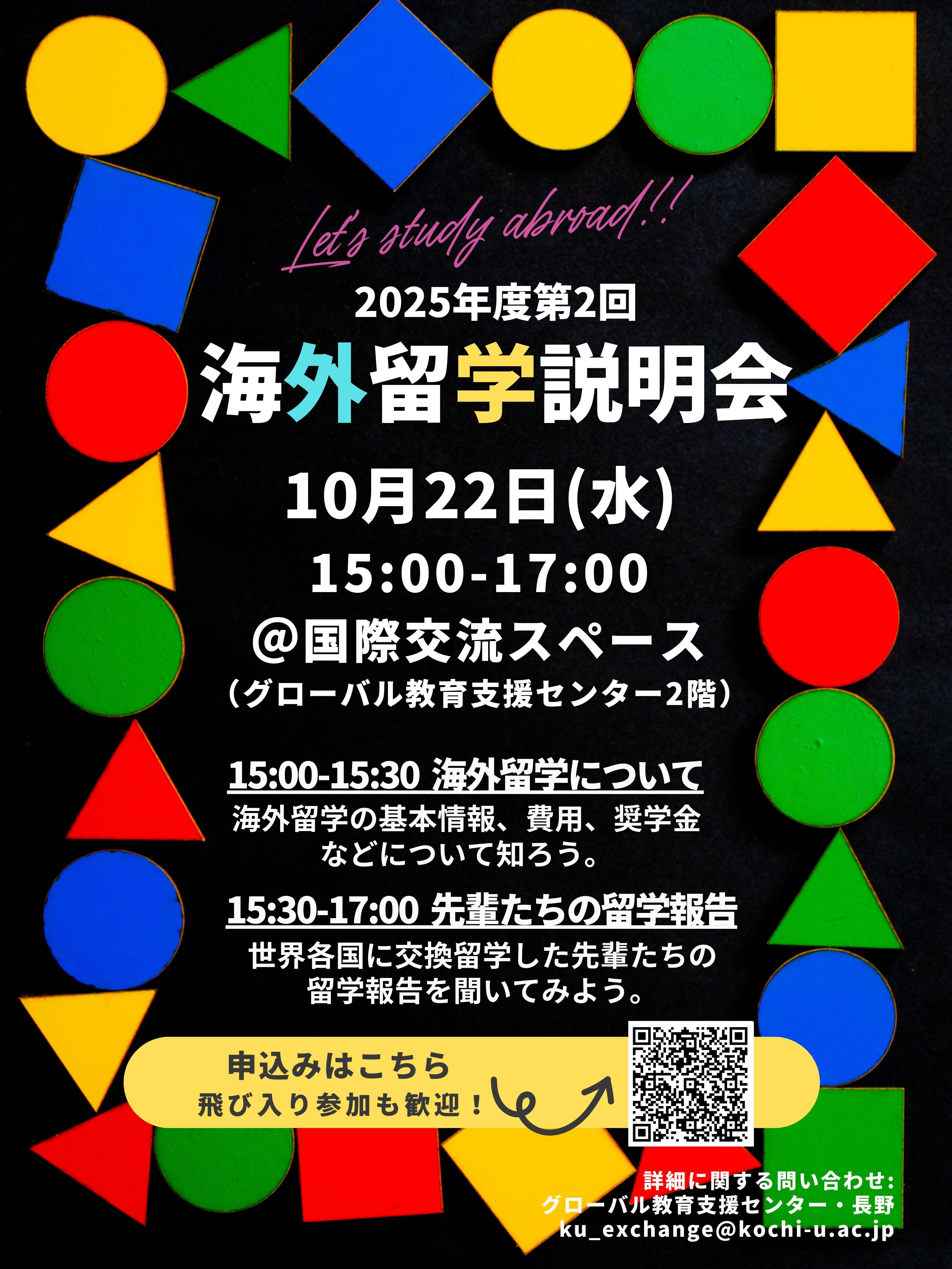 高知大学グローバル教育支援センター・長野 ku_exchange●kochi-u.ac.jp(“●”を“@”(半角文字)に変えて送信してください。) |