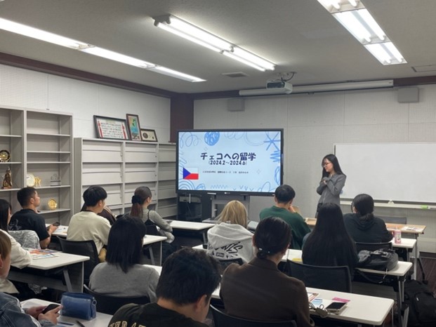 センター教員による留学の基本情報に関する説明に加え、交換留学から帰国した学生4名(チェコ、ノイギリス、韓国、スウェーデン)が留学報告を行いました。留学先での生活の様子や履修した授業、留学にかかった費用など、写真を交えながら楽しく報告をしてくれました。参加者の中には、説明会終了後も個別で質問を行っている人もおり、本説明会を通して、より具体的に留学のイメージを持つことができた様子でした。