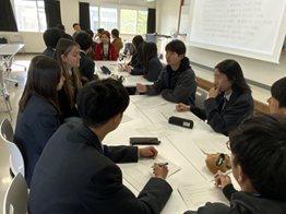 それぞれの発表が終わった後、12名の留学生を囲んで6グループに分かれて15分間ずつ自己紹介や発表に対する質疑応答、高校生が探究学習で調べてきたテーマについてグループメンバーで語り合いました。15分経った後、次のグループに移動し質疑応答と話し合いをし、3回のグループ活動が行われました。グループを移動するごとに皆表情が柔らかくなり、自信を持ってコミュニケーションが取れる様子がうかがえました。そして、交流会が終わりを迎える頃には皆すっかり打ち解けており、大方高等学校の生徒の制服を留学生が着て一緒に写真を撮る姿も見られました。