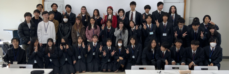 2025年12月12日(金)に、高知県立大方高等学校2年生32名が多文化共生社会をテーマとした探究学習の一環として高知大学に訪れ、本学の留学生12名と日本語で交流しました。今回の活動は、本学の留学生との交流を通し、様々な立場の人の話を聞くことで多文化共生についての問題を多角的な視点でとらえる機会とするとともに、異文化に触れる経験を通して国際理解を深めるという目的で行われ、中国から5名、マレーシアから2名、ネパール、台湾、韓国、カザフスタン、イギリスから各1名が交流会に参加しました。