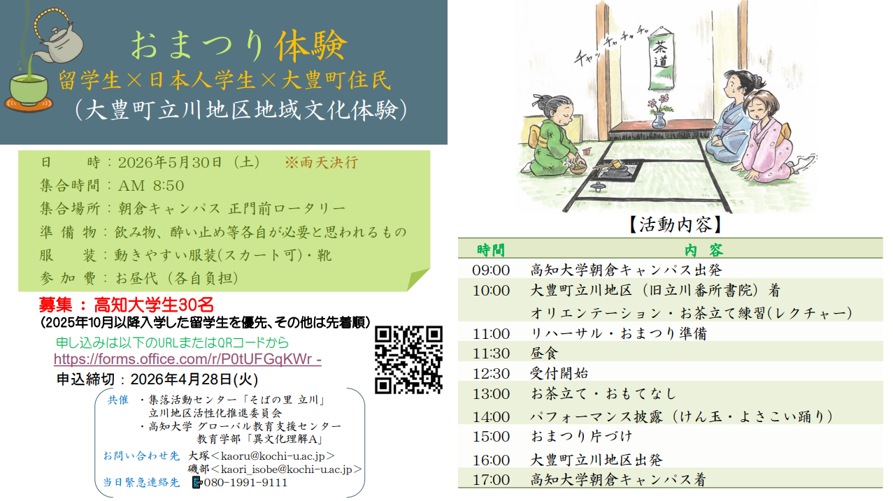 2026年5月30日(土)に大豊町立川地区にある重要文化財の「旧立川番所書院」で行われる「春の御殿まつり」の運営スタッフとして参加したい学生(留学生・日本人学生)を募集します。