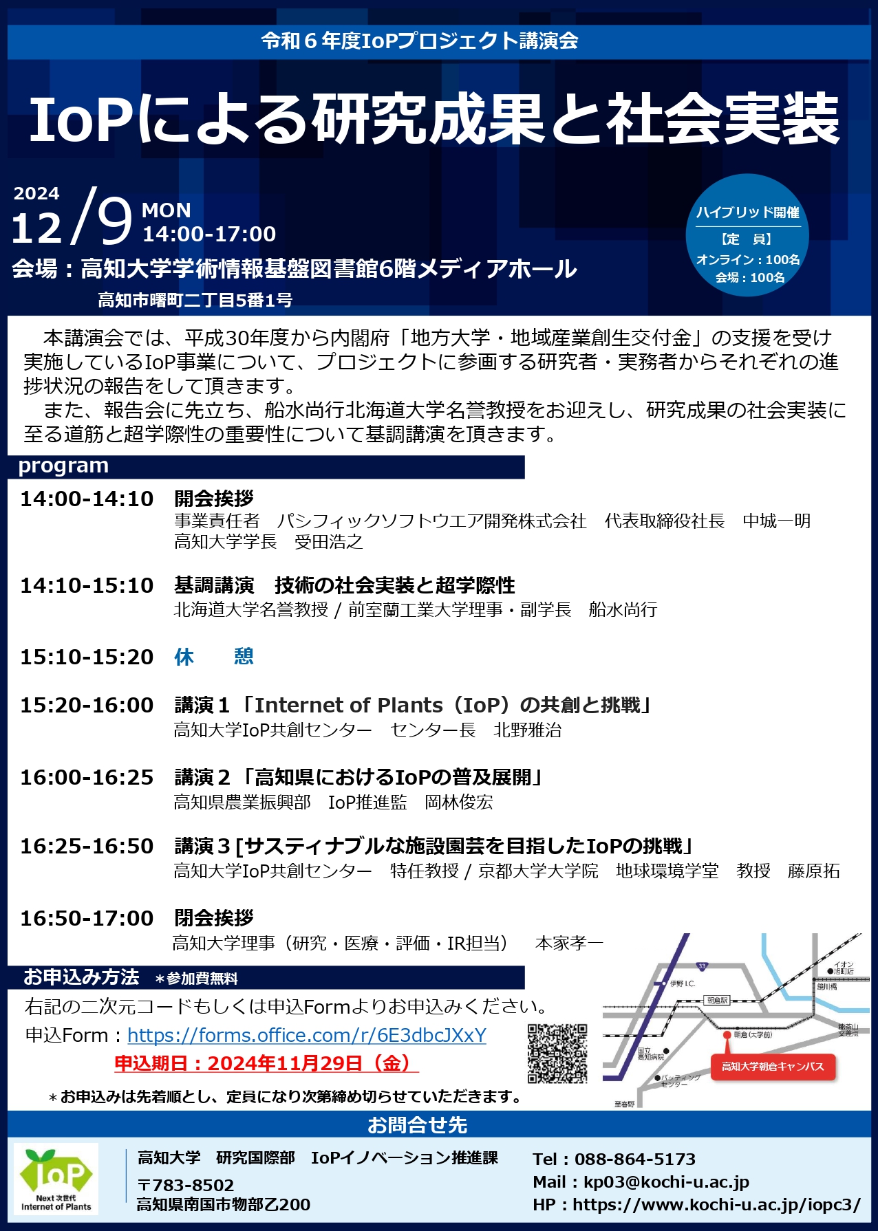 令和6年度IoPプロジェクト講演会「IoPによる研究成果と社会実装」を令和6年12月9日(月)高知大学朝倉キャンパスにて開催いたします。