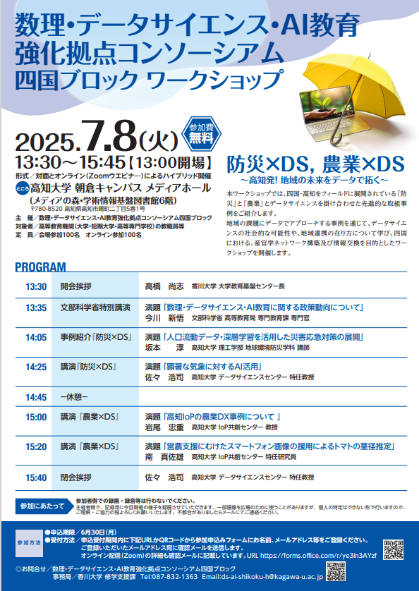 - 2025年7月8日(火)に開催される「数理・データサイエンス・AI教育強化拠点コンソーシアム 四国ブロックワークショップ」へ岩尾教授及び南特任研究員が登壇します。