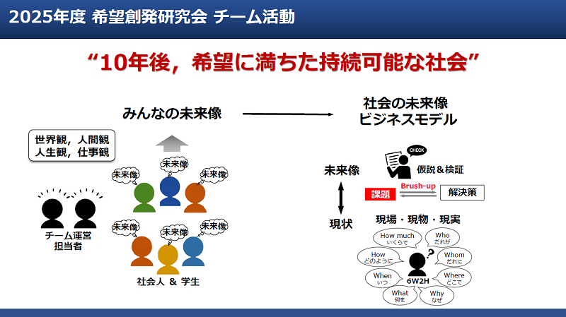 令和7年度は、13名の参画企業人は様々な業種の方々が全国から参加します。また、学部1年生から博士課程2年生まで幅広い学年の学生が企業人と共に過ごす1年間に魅力を感じ、参加します。『共に語り、共に学び、共に創る』を合言葉に、多様な仲間が集まり、希望創発研究会の令和7年度の活動が始まりました。