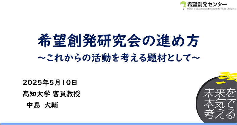「理念醸成セミナー-希望創発センターとは?-」、「希望創発研究会の進め方~皆で考える題材として~」他