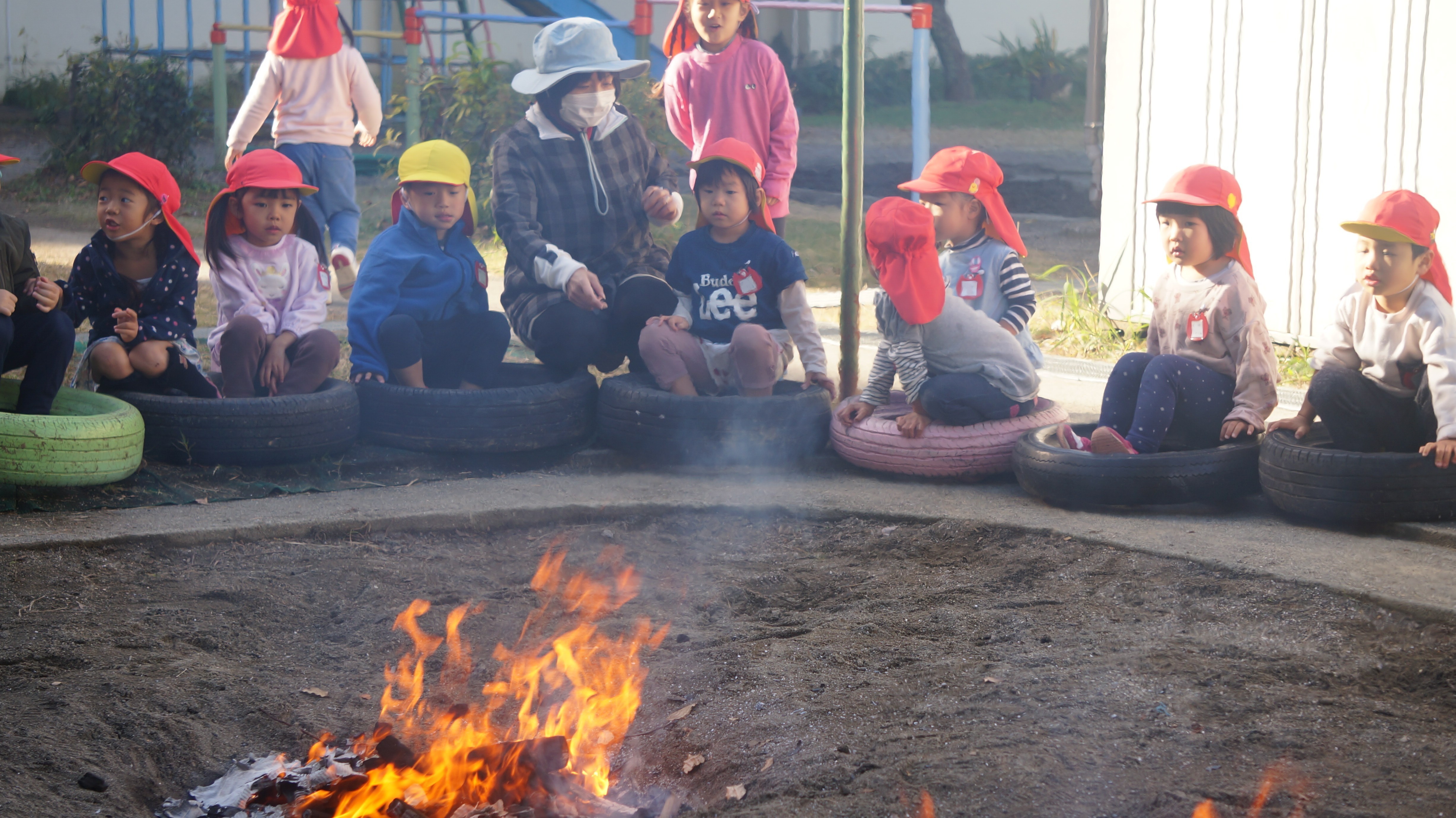年長組のお世話で、園の畑で掘ったお芋を砂場の炭火でじっくりと焼き、みんなで味わいます。