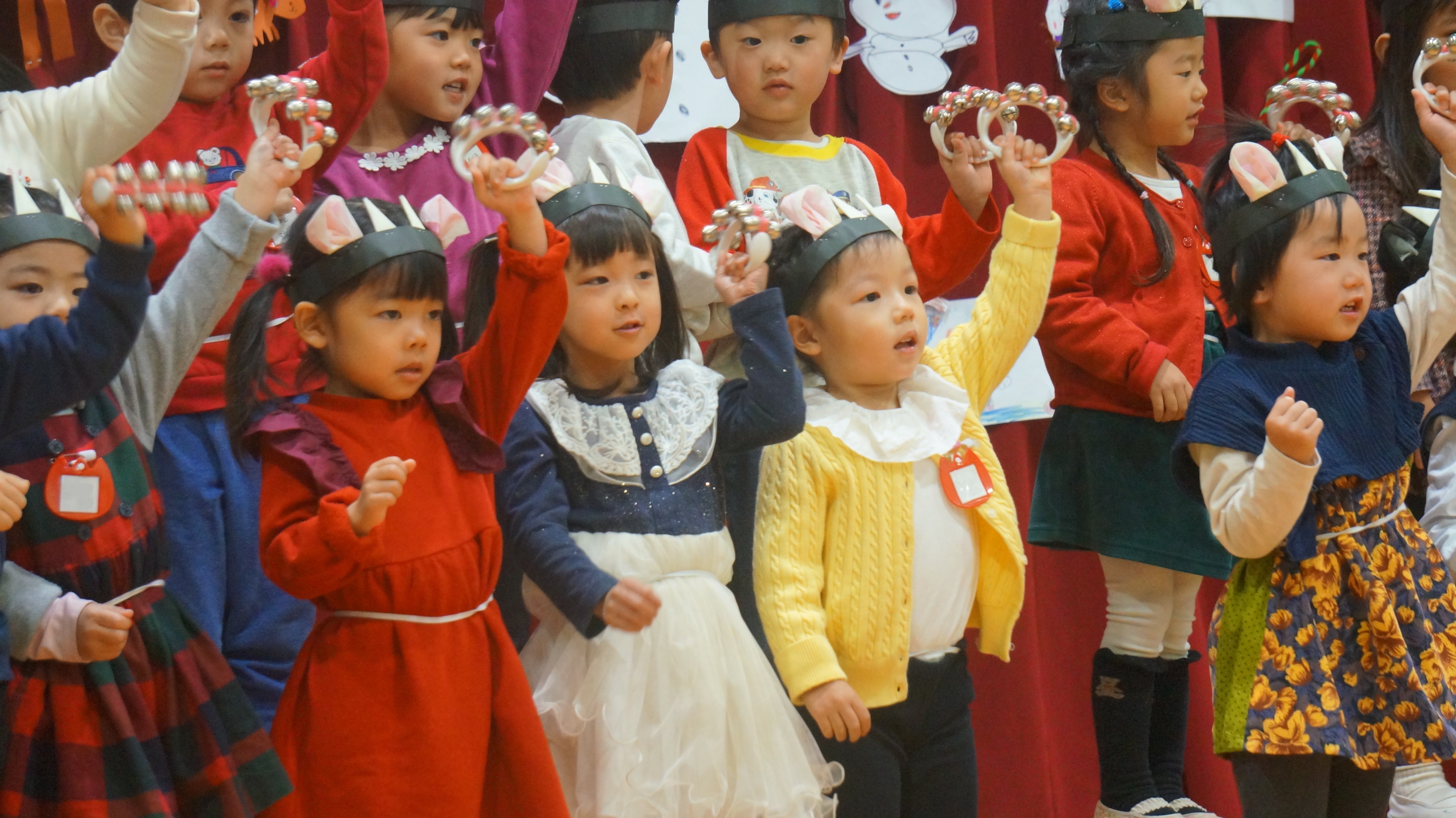 クリスマスツリーなどで飾り付けた遊戯室で、学年ごとに歌ったり演奏したりして、プレゼントをかついだサンタクロースを楽しみに待ちます。