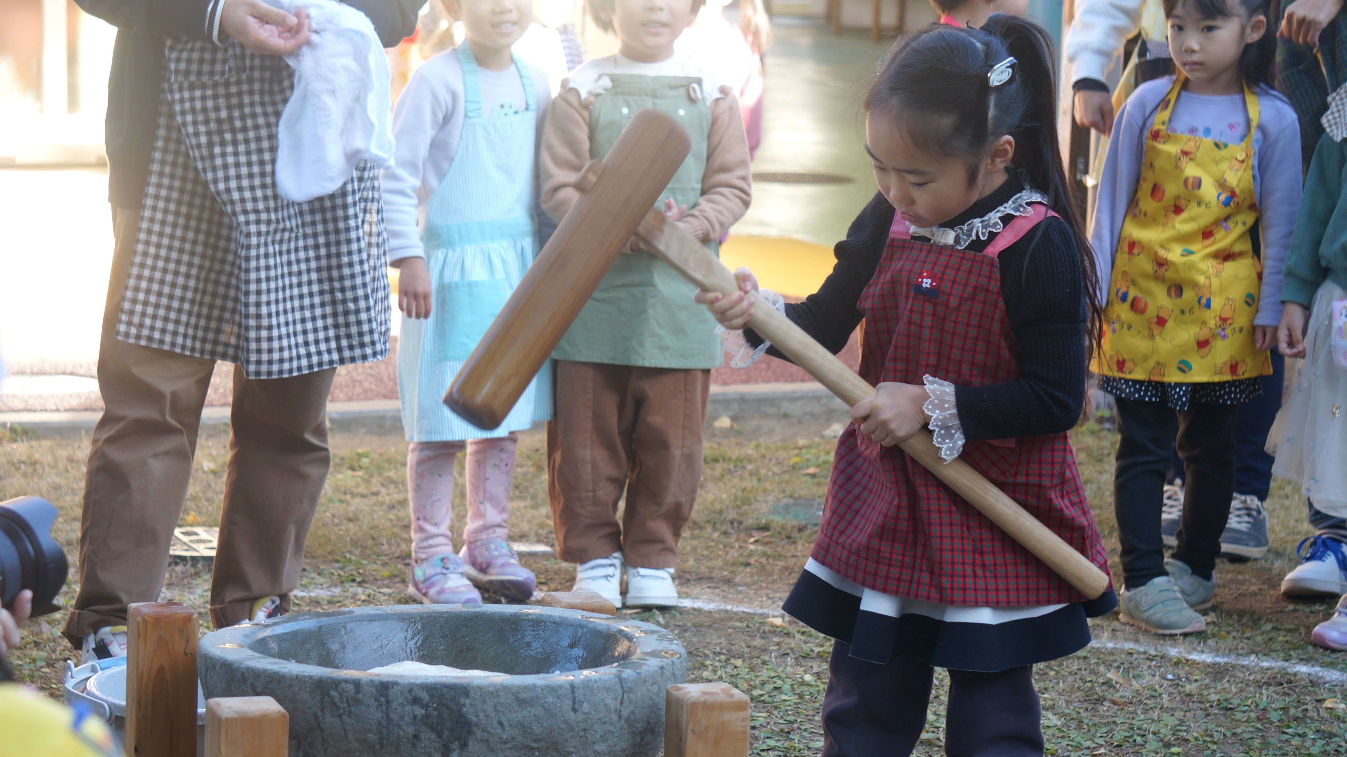 昔ながらの杵と臼でお餅をつきます。附属特別支援学校のお兄さんお姉さんや、お家の方にもお手伝いに来てもらい、ミニ鏡餅を作ります。