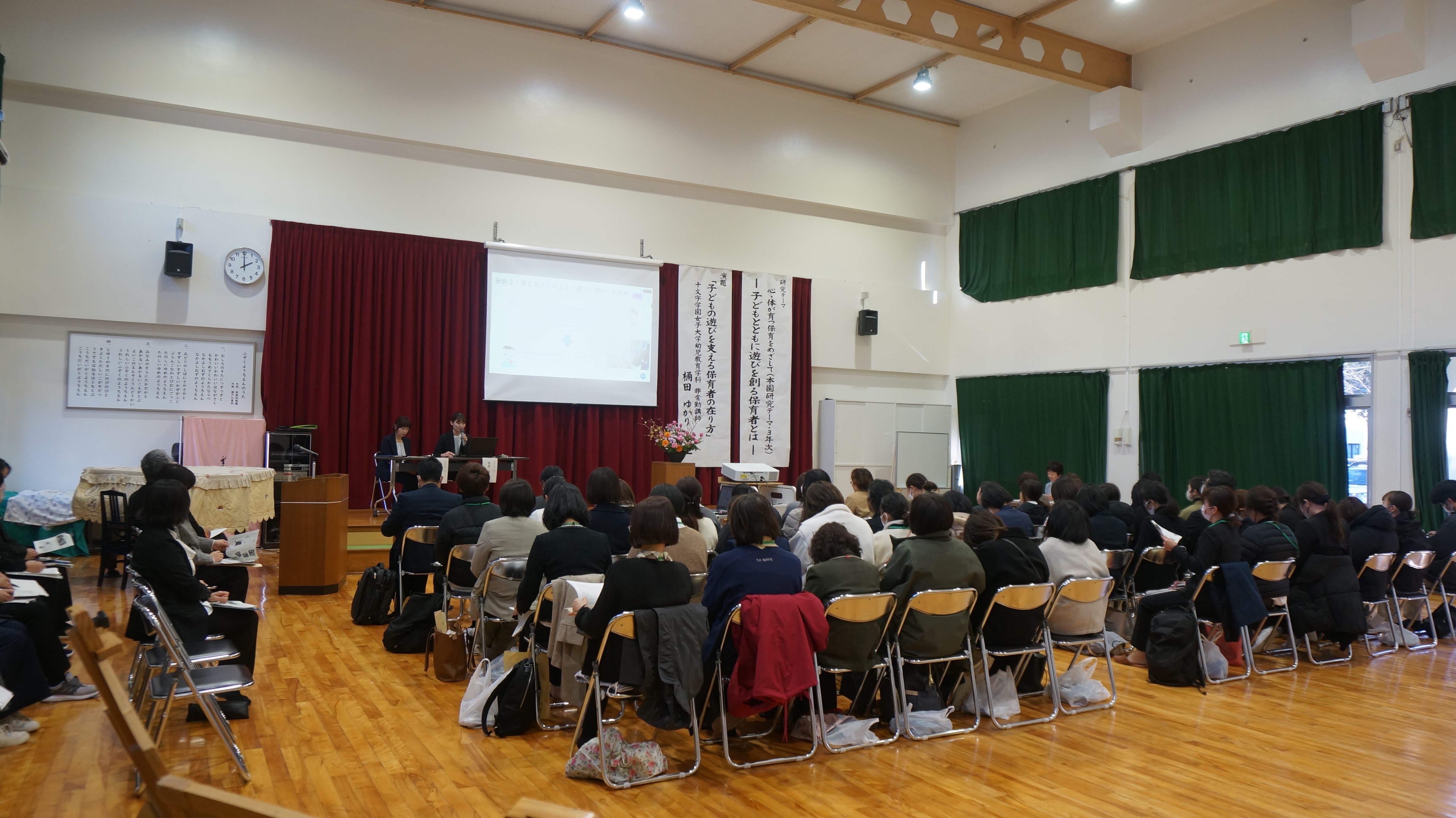 一年間の研究の取組を、公開保育やその協議、実践発表や講話で県内外の保育者に発信します。