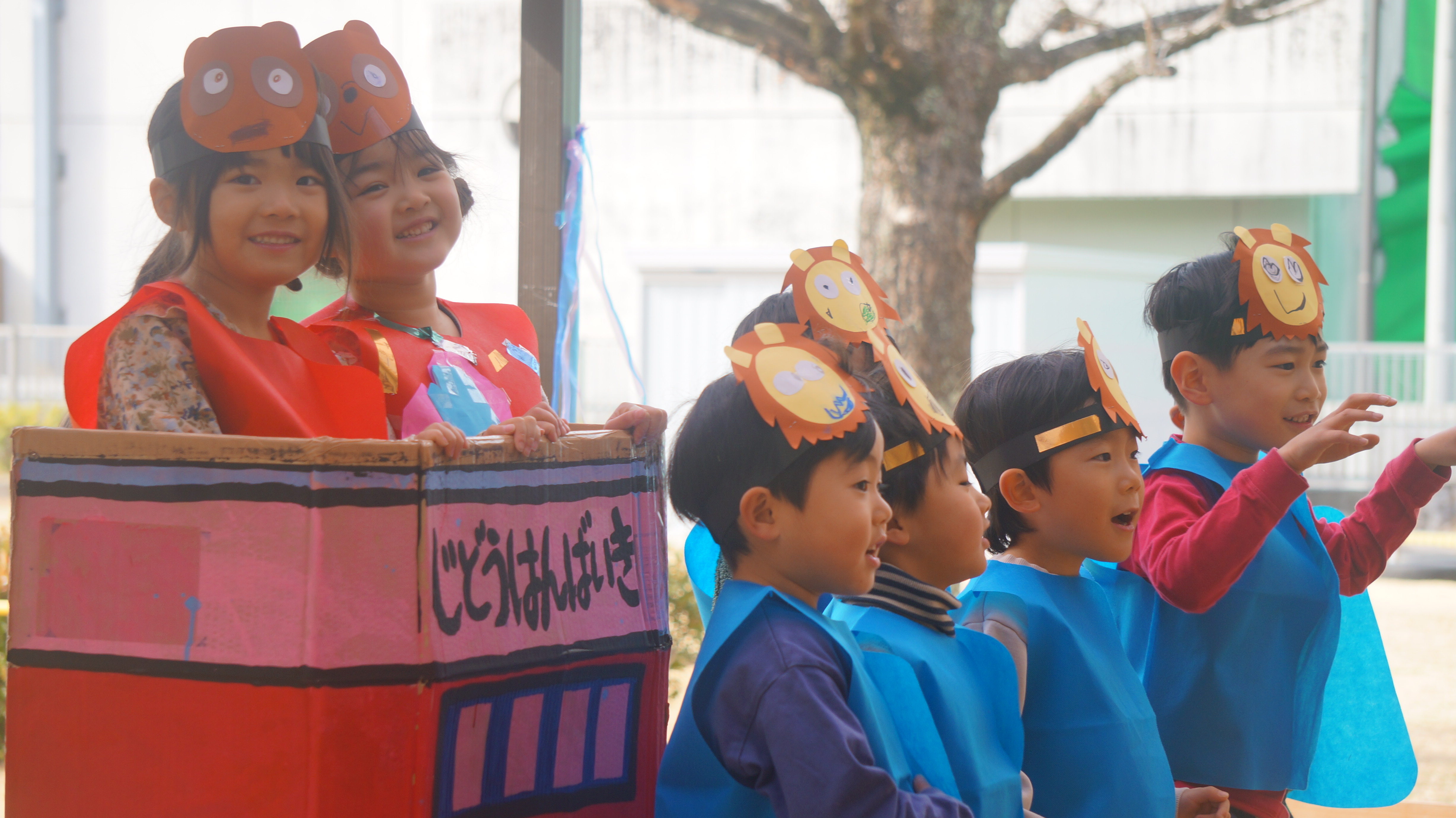 親しんできたお話の世界を、友達や先生と一緒に考えて表現し、劇遊びを楽しみます。