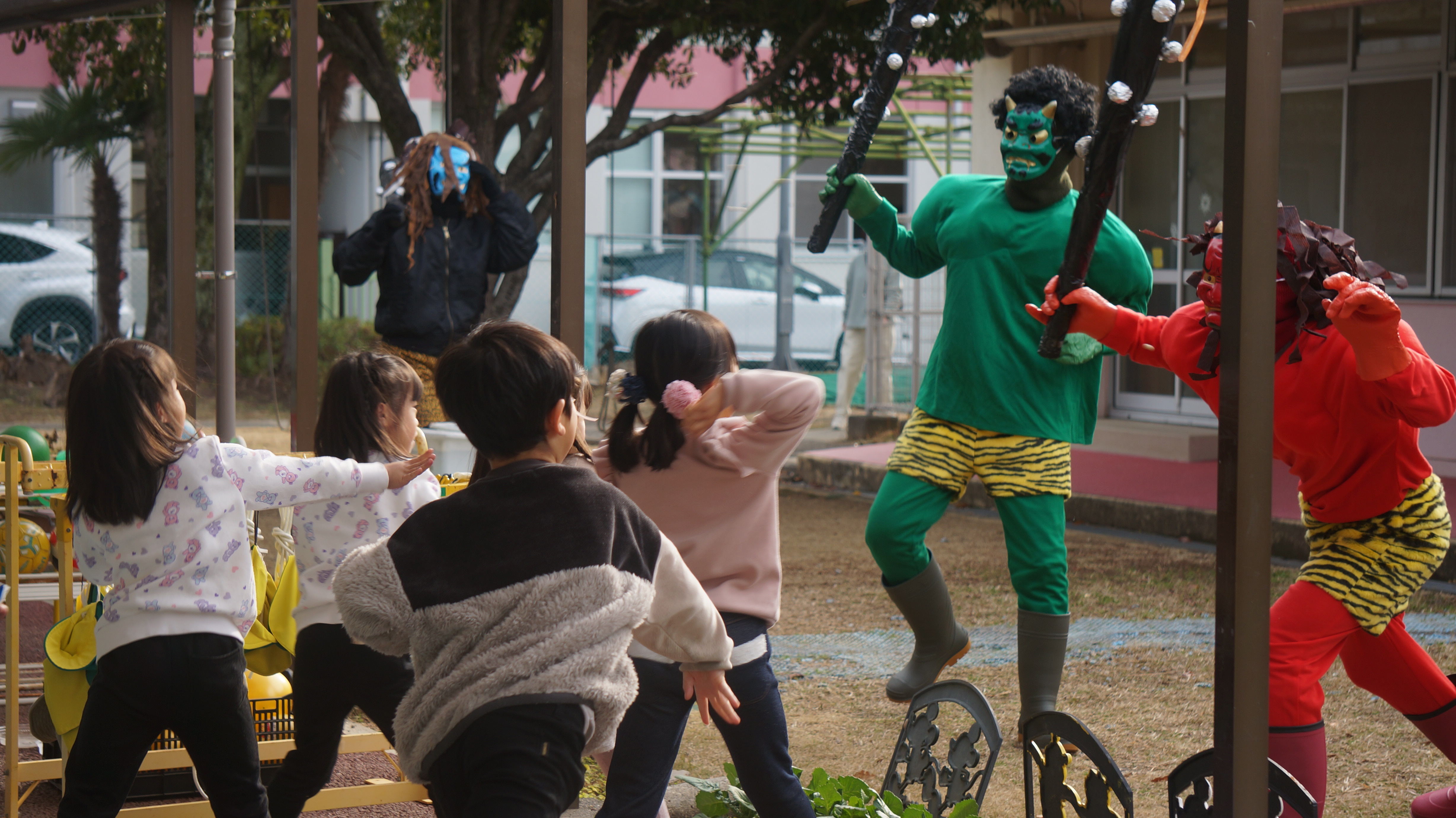 「鬼は外、福は内!」鬼たちに負けずに子どもたちが豆を投げると、福の神も来てくれます。