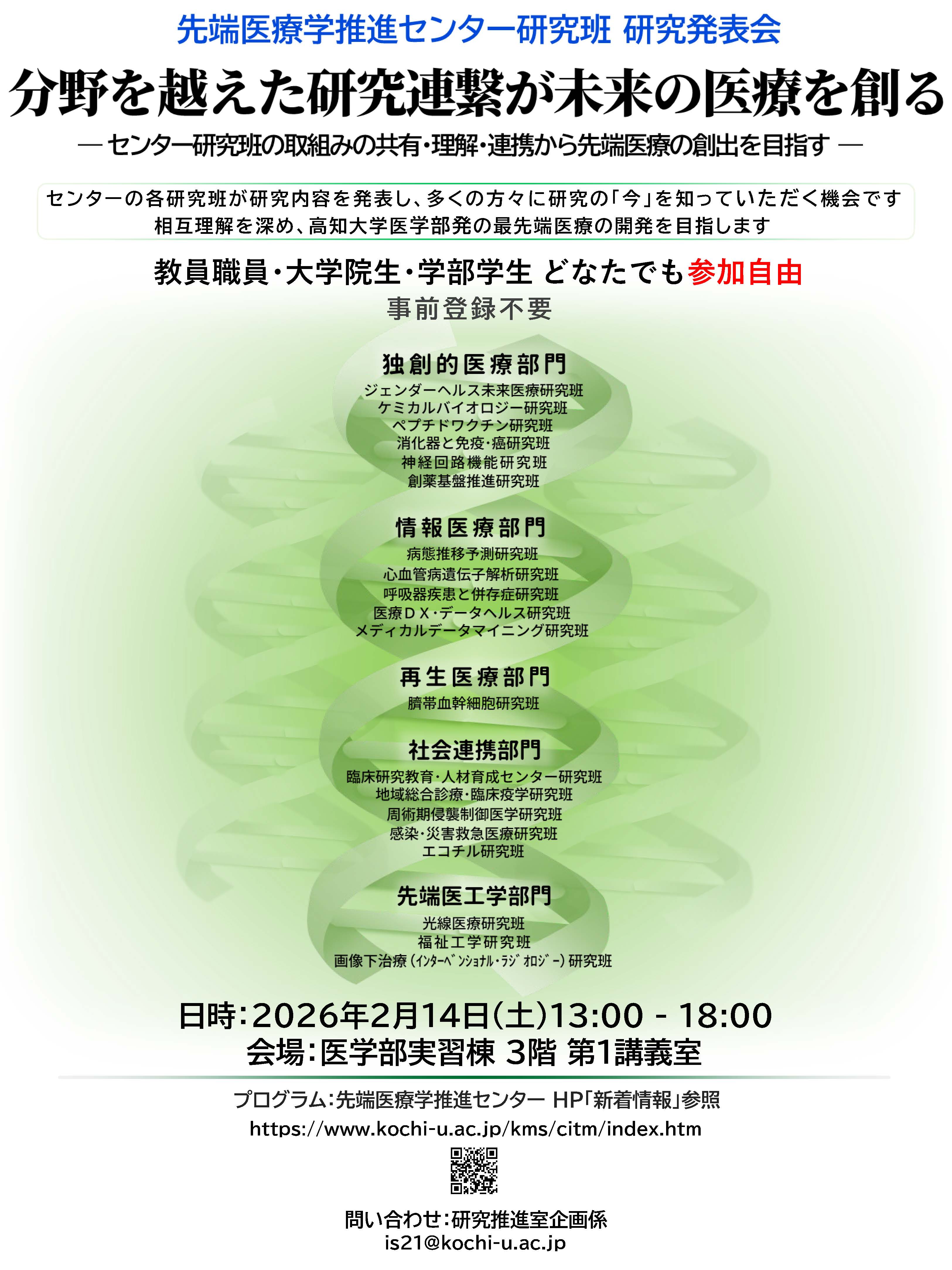 2026年2月14日(土)13:00より、先端医療学推進センター研究班研究発表会を行います。 先端医療学推進センター研究班 研究発表会 日時:2026年2月14日(土)13:00 - 18:00 場所:医学部実習棟 3階 第1講義室 参加:教職員・大学院生・学部学生 どなたでも参加自由、事前登録不要 センターの各研究班が研究内容を発表して、多くの方々に知っていただく機会です。お互いの理解を深めて高知大学医学部発の最先端医療の開発を目指します。 参加自由、事前登録不要です。ぜひ気軽にご参加ください。 (プログラムの詳細はしばらくお待ちください。確定次第掲載いたします。)