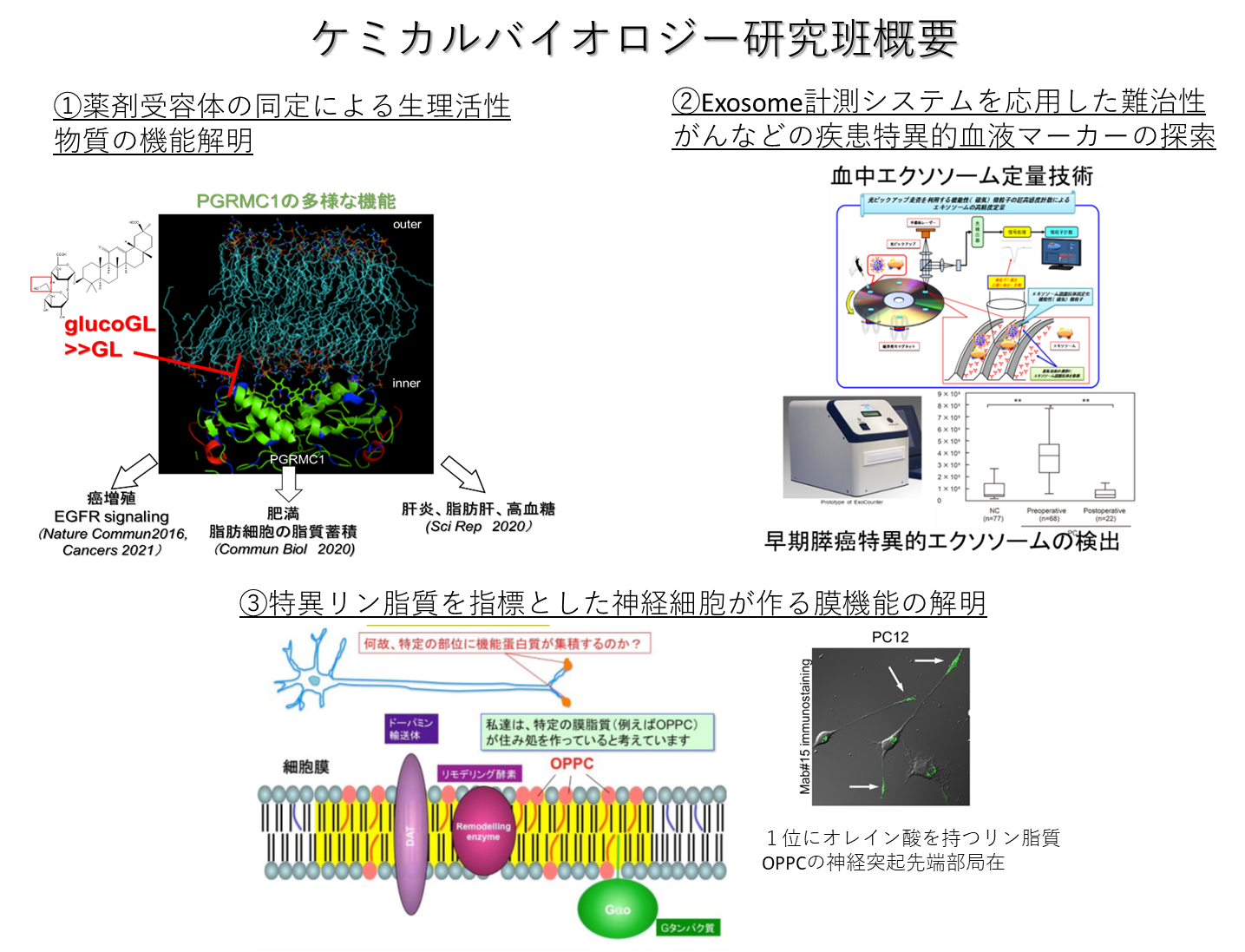 本研究班では、ナノビーズテクノロジーを利用した薬剤の標的となる受容体タンパク質の精製技術とこの受容体情報を指標としたケミカルバイオロジー解析、さらにナノビーズ技術と光センサーデバイスを融合した独自のバイオセンサーExosome計測技術を臨床応用した疾患マーカーの解析を行っています。また、脂質生化学的な手法を用いて細胞膜機能を制御するメカニズムの解明や、細胞膜上の構成分子の同定とその動態解析、細胞膜由来の細胞外分泌小胞の定量解析は、細胞膜を介する細胞機能全般やその異常などの未知の生理機能の解明や病態における関わり解析しています。これらの解析を通して、基礎医学、創薬、臨床展開を見据えた研究を進めて行きます。
