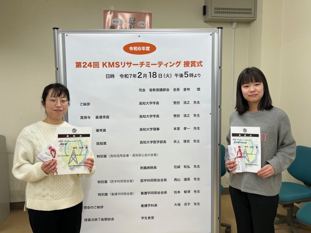 第24回KMSリサーチミーティングにおいて、大学院生の濱田先生が奨励賞、先端医療学コースの武内さんが同窓会賞に選出されました。