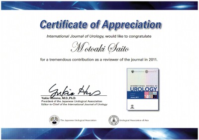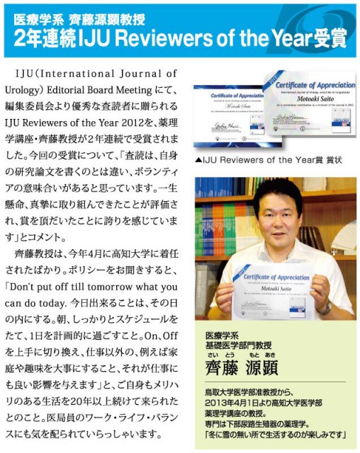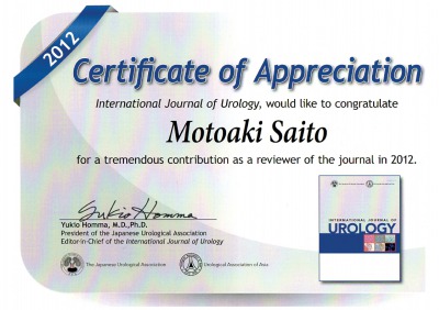 齊藤教授がInternational Journal of Urology (IJU) Reviewers of the Year 2012を受賞しました。