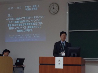演題は "ヘモグロビン由来ペプチドRVD-ヘモプレッシンのラット脳室内投与はボンベシンにより惹起される中枢性副腎髄質賦活に対し脳内カンナビノイドCB1受容体を介して抑制性に作用する" です。