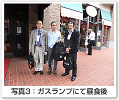 学会の合間に観光にも行きました。天気はあいにくの曇りと雨でしたが、トロリーに乗ってダウンタウンの街並みを眺めたり、景色の良い湾岸沿いを散歩したり、美味しい地元料理を食べたりしました。San Diegoは想像以上にきれいで安全な街でした。写真3はガスランプという古い街中にあるシーフードレストラン前で昼食後に撮った写真です。