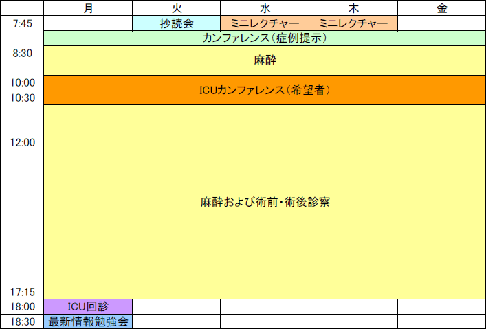 しかし、これらの領域は麻酔科学の知識、手技が土台として非常に重要となります。そこで、原則として当院および関連病院で3カ月以上、麻酔科研修を選択された方を対象とさせていただいています。以下に基本プログラムを示しますが、希望に応じて変更することも可能です。興味のある方は是非、当講座までお問い合わせください。