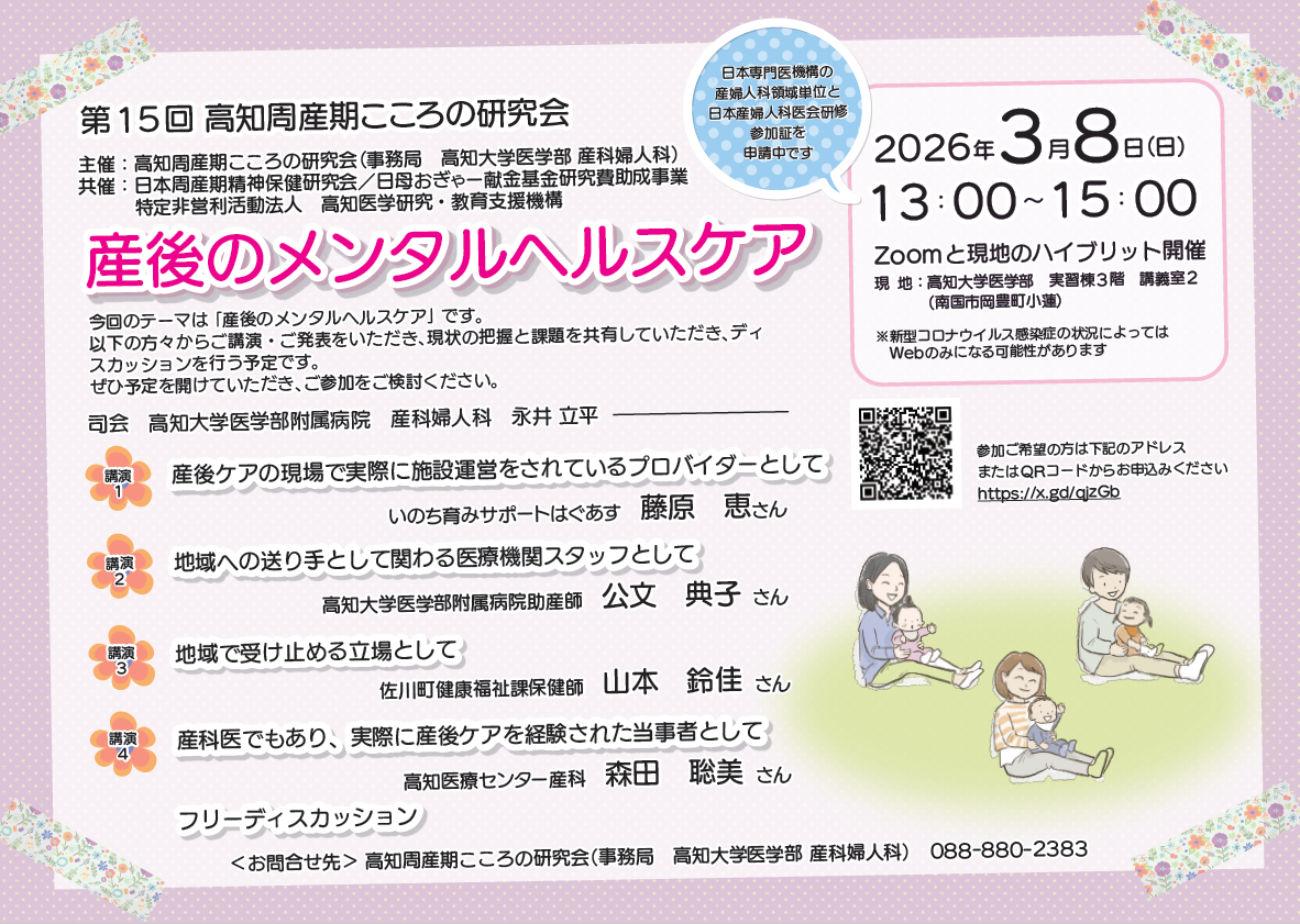 公開日 2026年2月16日 第15回 高知周産期こころの研究会からお知らせです ! 2026年3月8日(日)『産後のメンタルヘルスケア』を開催します。 ◀ Zoom と 現地のハイブリット開催 ▶ 現地:高知大学医学部 実習棟3階 講義室2 ご参加お待ちしています。 ※ポスターに詳細が追加されました。