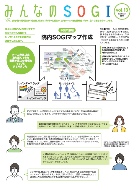 研修、提言などの活動を通じて、附属病院職員のSOGI(Sexual Orientation and Gender Identity;性的指向と性自認)への理解を深めることを目的とし、多様な性への在り方を持つ人々が苦痛なく安心して受診、治療を行うことができる院内環境づくりを目指しています。