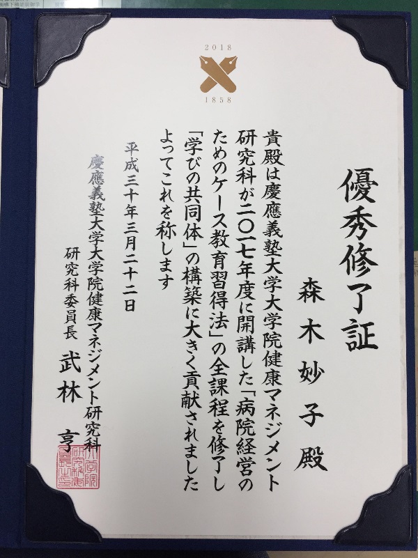 2018.3.22 活動報告 慶應義塾大学「病院経営のためのケース教育習得法」を受講しました。 2018年3月22日高知大学医学部看護学専攻 森木妙子教授が、慶應義塾大学「ケースとデータに基づく病院経営人材プログラム」における「病院経営のためのケース教育習得法」を受講し、修了証が送られました。