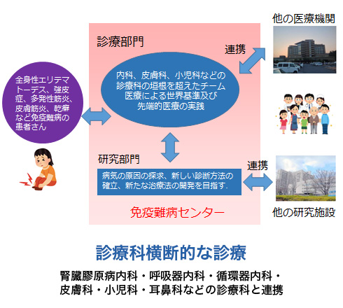 当センターでは免疫難病センター所属の医師とともに、各診療科(腎臓・膠原病内科、呼吸器内科、皮膚科、循環器科、耳鼻科等)の医師達が参加して診療を行います。
