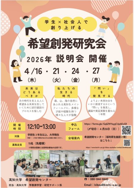 高知大学生、大学院生の皆さん、こんにちは! 希望創発センターです。 2026年5月開始の『希望創発研究会』に参加する学生さんを募集します。 希望創発研究会は、学生と社会人が対等な立場で語り合い、学び合い、そして共に「創…もっと見る -