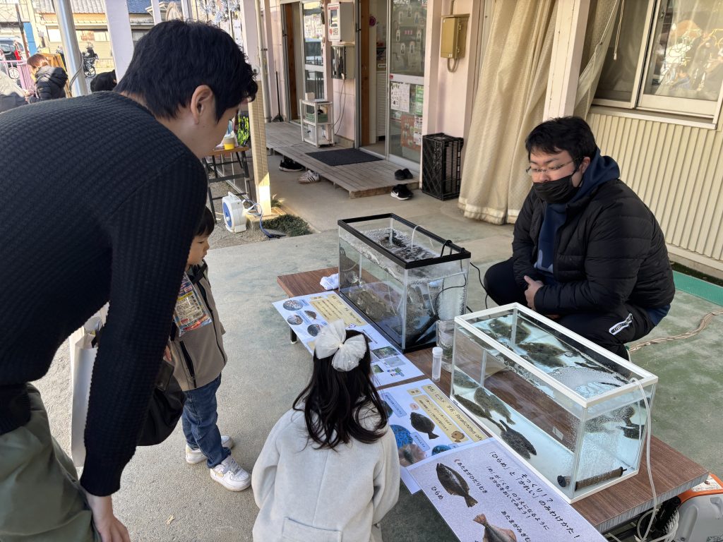 当日は、親子あわせて約100名の参加があり、会場は終始にぎやかな雰囲気に包まれていました。水槽の中を泳ぐ魚をのぞき込みながら、「これなに?」「おいしい魚?」と子どもたちが目を輝かせて質問する姿が多く見られ、普段なかなか目にすることのない“食用の養殖魚”に強い関心を示している様子が印象的でした。