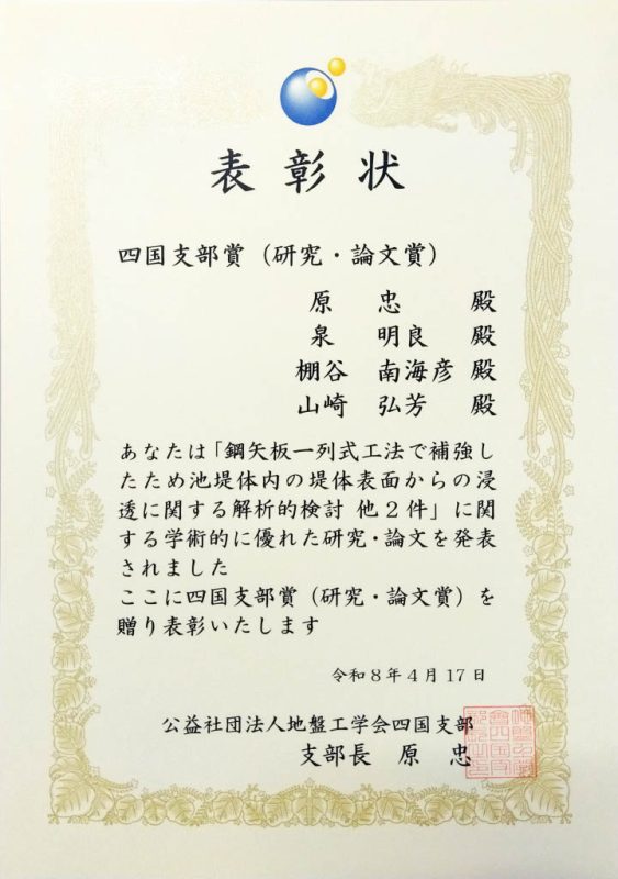 四国支部賞は地盤工学の学術並びに技術の発展と学会支部活動の活性化に寄与した優れた業績を表彰するものです。