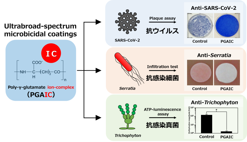 新型コロナパンデミック以後、予防的な公衆衛生技術の確立が求められています。なかでも人口減少と高齢化の局面を迎えた我が国では、喫緊の課題といえます。予防公衆衛生学では、ウイルス・細菌・カビなど、起源の異なる病原体を横断的かつ持続的に不活化することが課題になります。芦内教授らは、納豆ネバの成分「ポリγグルタミン酸(PGA)」と食品添加物ポジティブリスト記載の「セチルピリジニウム(CPC)」から、超広域(万能)抗菌性を具備する新素材「ポリγグルタミン酸イオンコンプレックス(PGAIC)」の開発と生産に成功しました。PGAICの優れたコーティング機能を応用した抗菌表面加工法も考案されています。