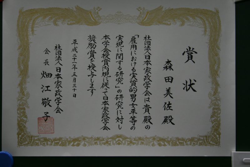 森田准教授が日本家政学会奨励賞を受賞されました。