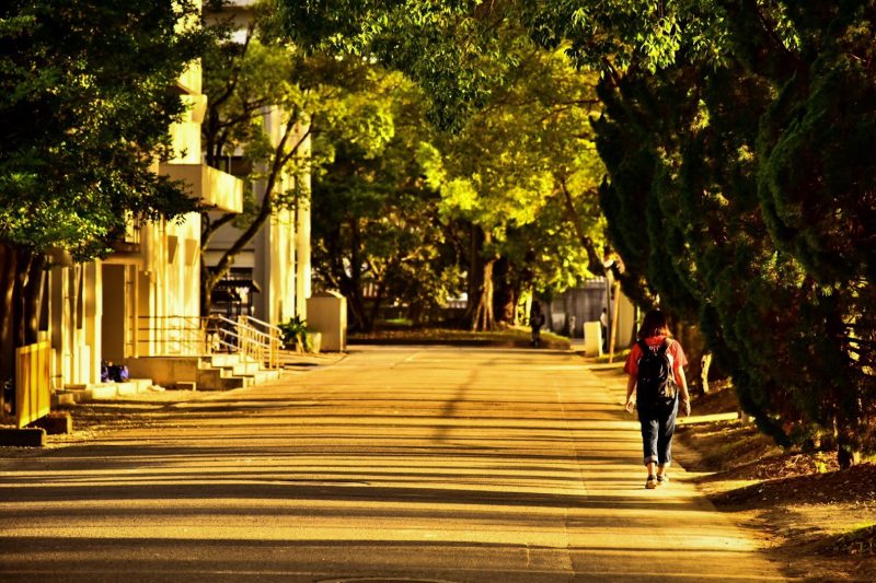 高知大学校内のグラウンド横の道にて、木々の間から差し込む日の光が美しく、この写真に収めました。