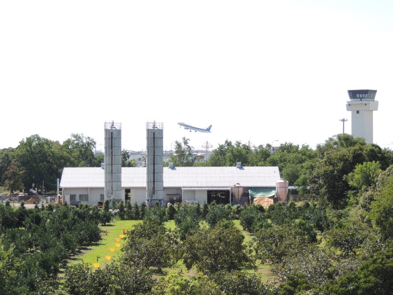 物部キャンパスは空港にものすごく近い。果樹園と牛舎の奥に、空港の管制塔と飛行機が飛ぶのが見えます。