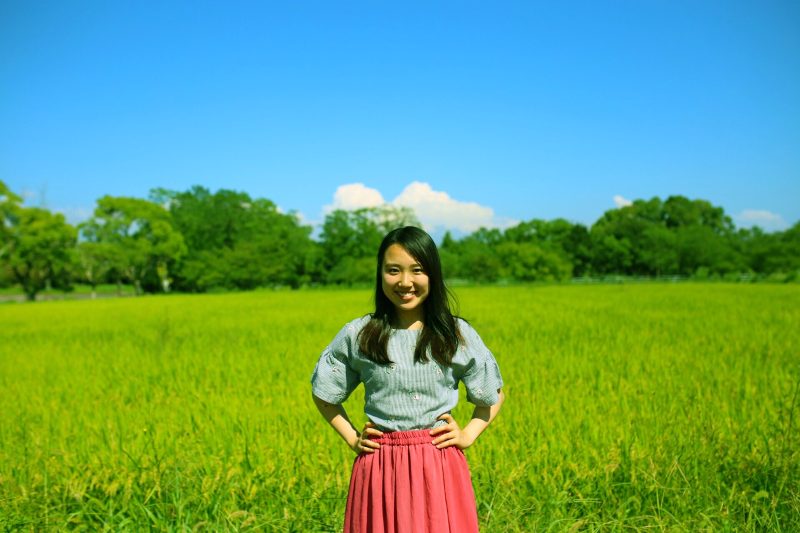 8月末、昼下がり。あっという間に夏も終わり。物部キャンパスの田んぼと青空、控えめな入道雲をバックに。