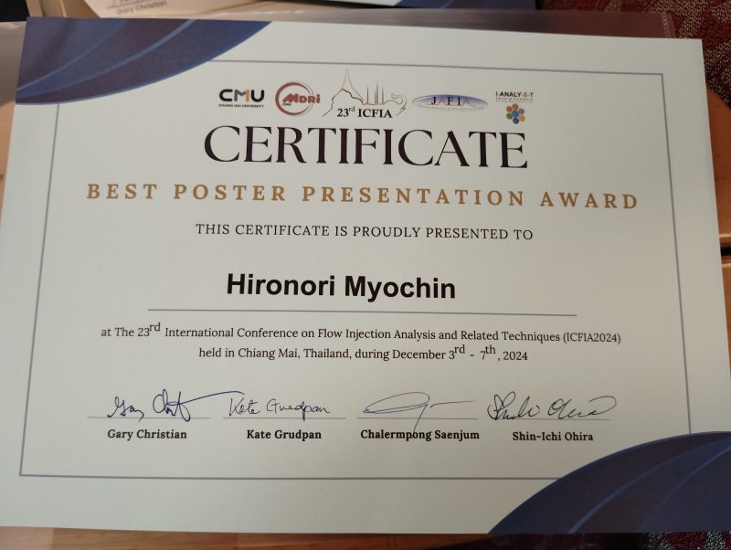 大学院応用自然科学専攻(博士課程)1年の明珍尋紀さん(理工学部教授 森勝伸研究室所属)が、The 23 rd International Conference on Flow Injection Analysis and Related Techniques (ICFIA2024)において、Best Poster Presentation Award(Poster Presentation)を受賞しました。